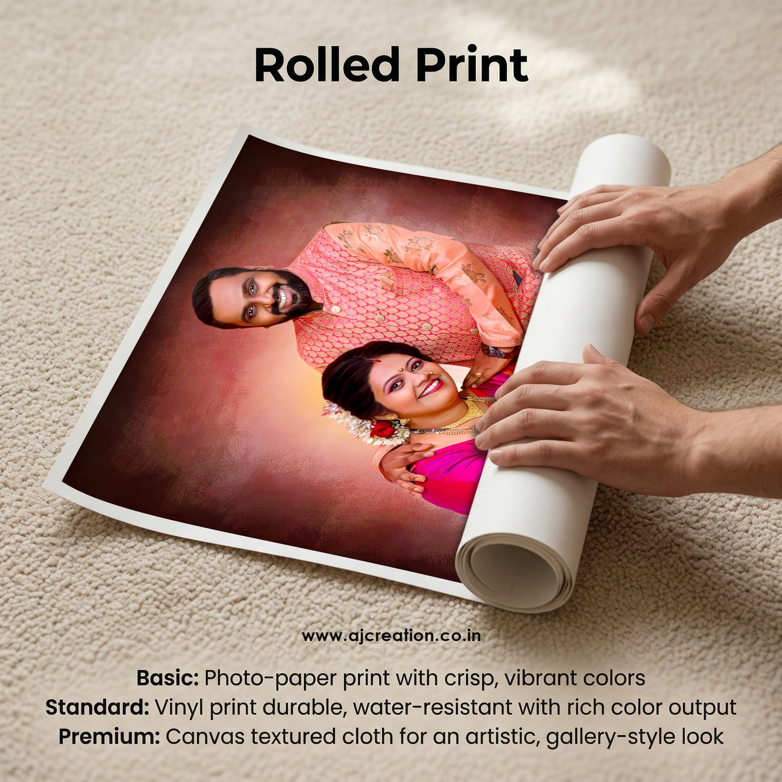 Rolled Print (Print Only – No Frame) :  Premium printed sheet without frame/board; safely rolled in a tube; perfect for custom framing.