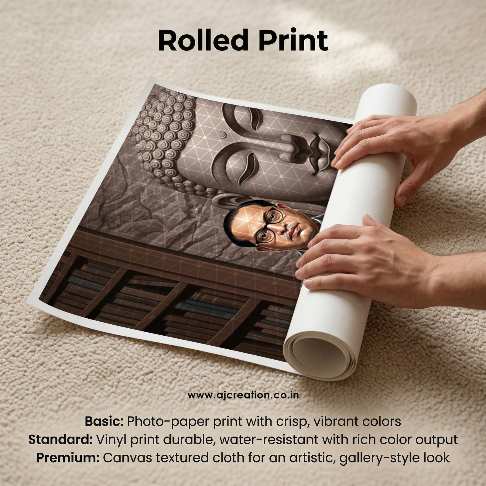 Rolled Print (Print Only – No Frame) :  Premium printed sheet without frame/board; safely rolled in a tube; perfect for custom framing.