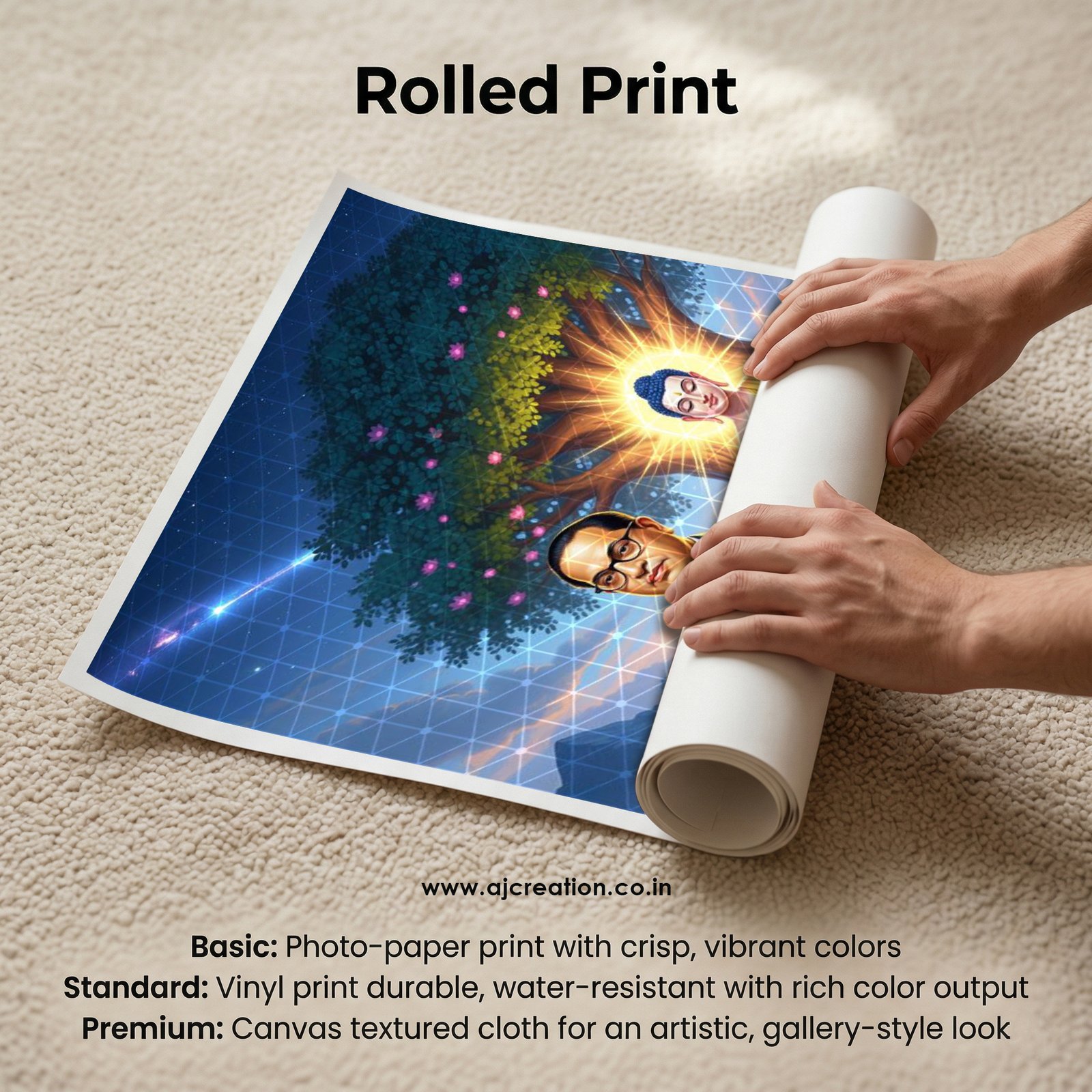Rolled Print (Print Only – No Frame) :  Premium printed sheet without frame/board; safely rolled in a tube; perfect for custom framing.