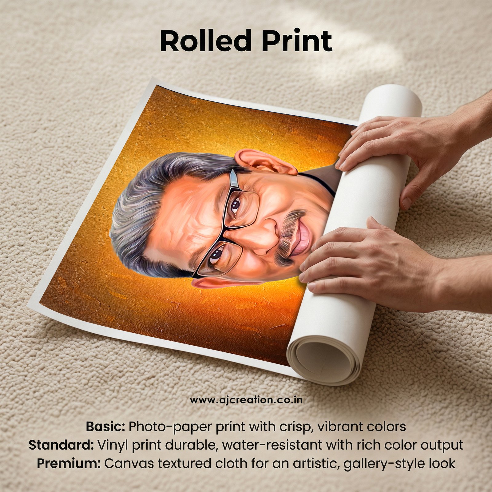Rolled Print (Print Only – No Frame) :  Premium printed sheet without frame/board; safely rolled in a tube; perfect for custom framing.